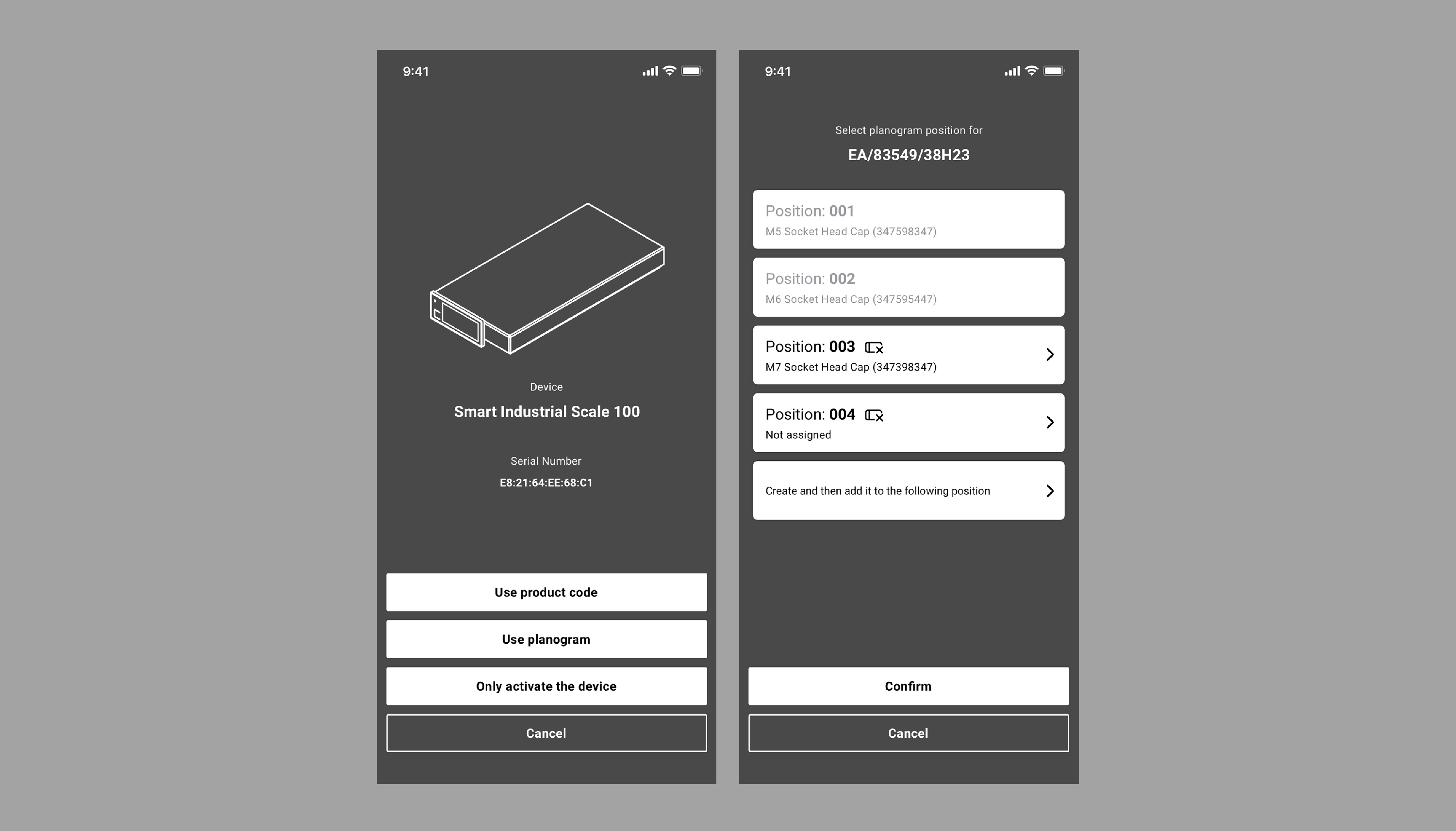 - Use Planogram - Bind the smart scale device to a specific planogram position. Scan or manually enter the shelf code and select the position.
