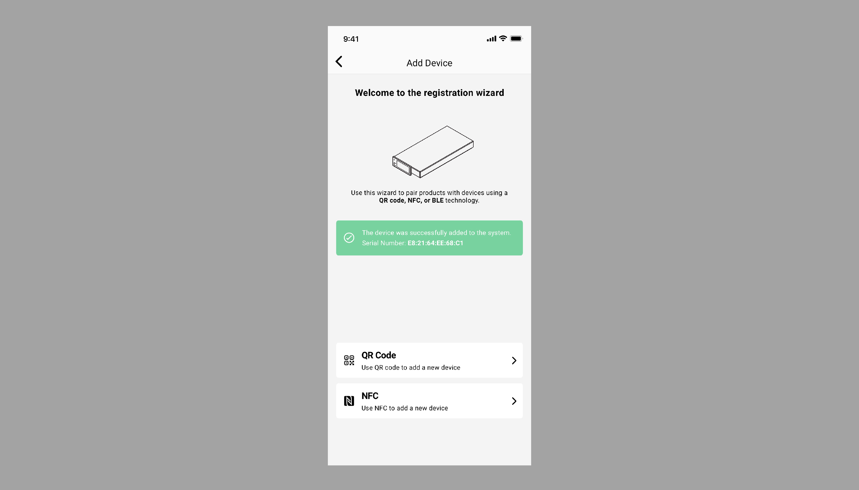 The registration wizard guides you through the registration process for the new smart scale device. There are two options to initiate registration: either via the QR Code on the device, which contains the serial number and ID, or via NFC;
